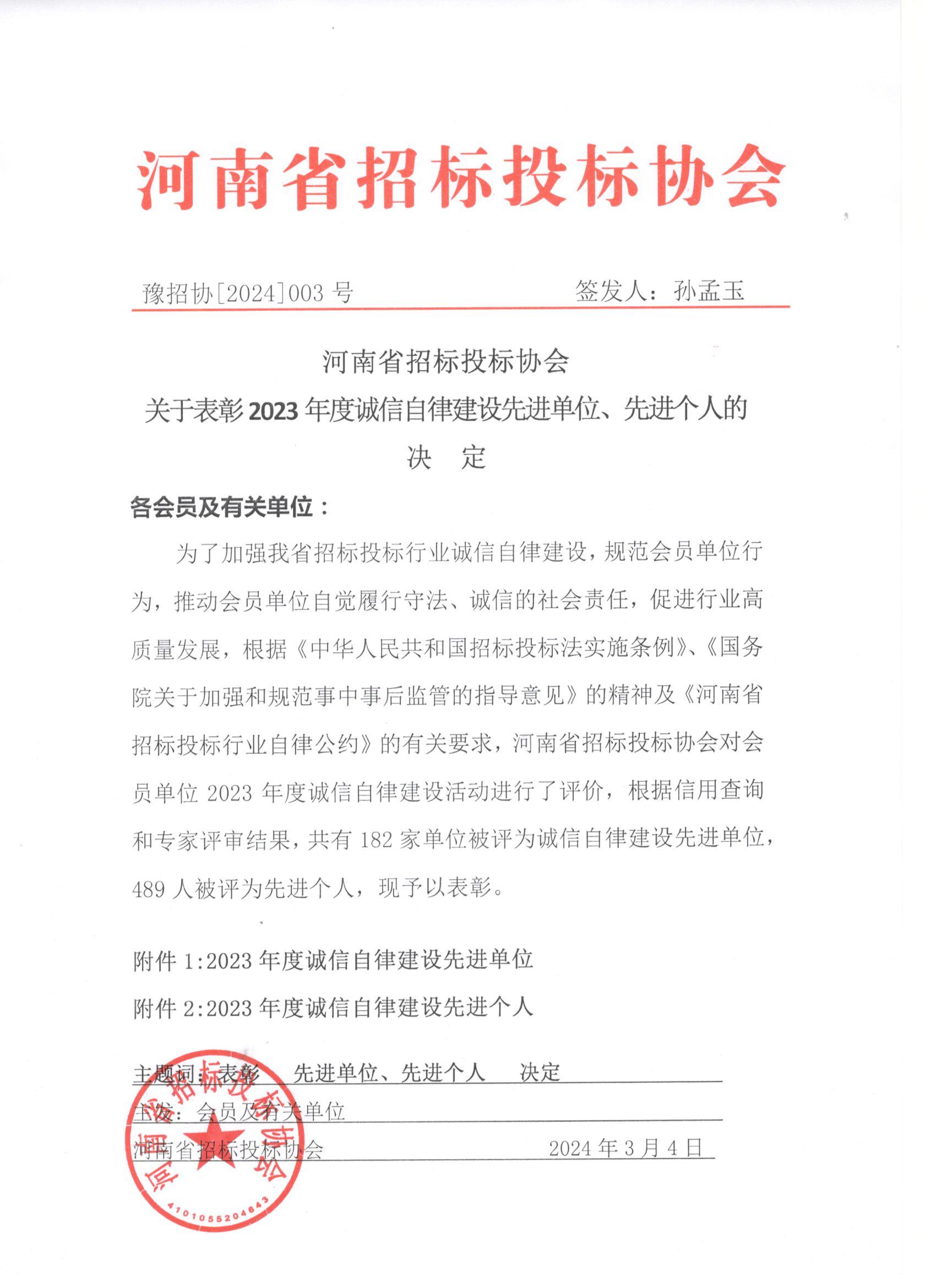 买球赛的正规app及李冉、李剑同志荣获“河南省招标投标协会2023年度诚信自律建设先进单位、先进个人”荣誉称号