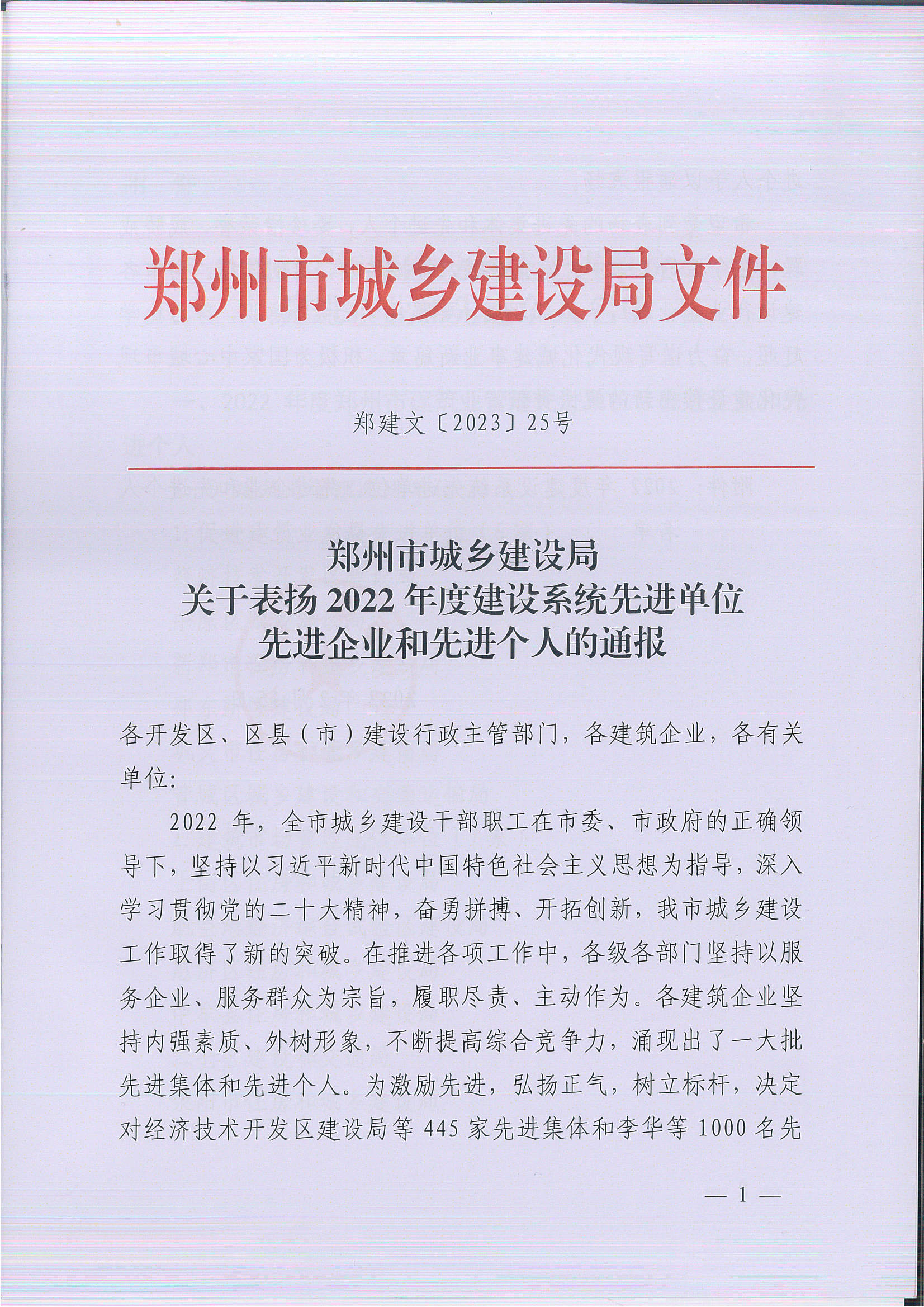 热烈祝贺公司被郑州市城乡建设局评为的2022年招标代理先进单位