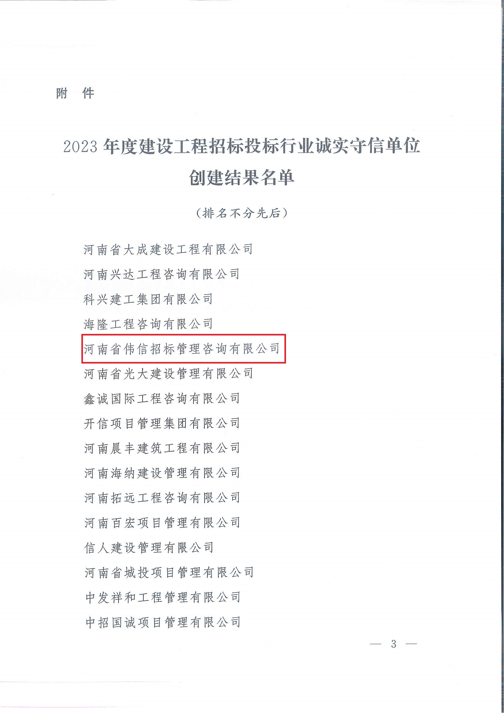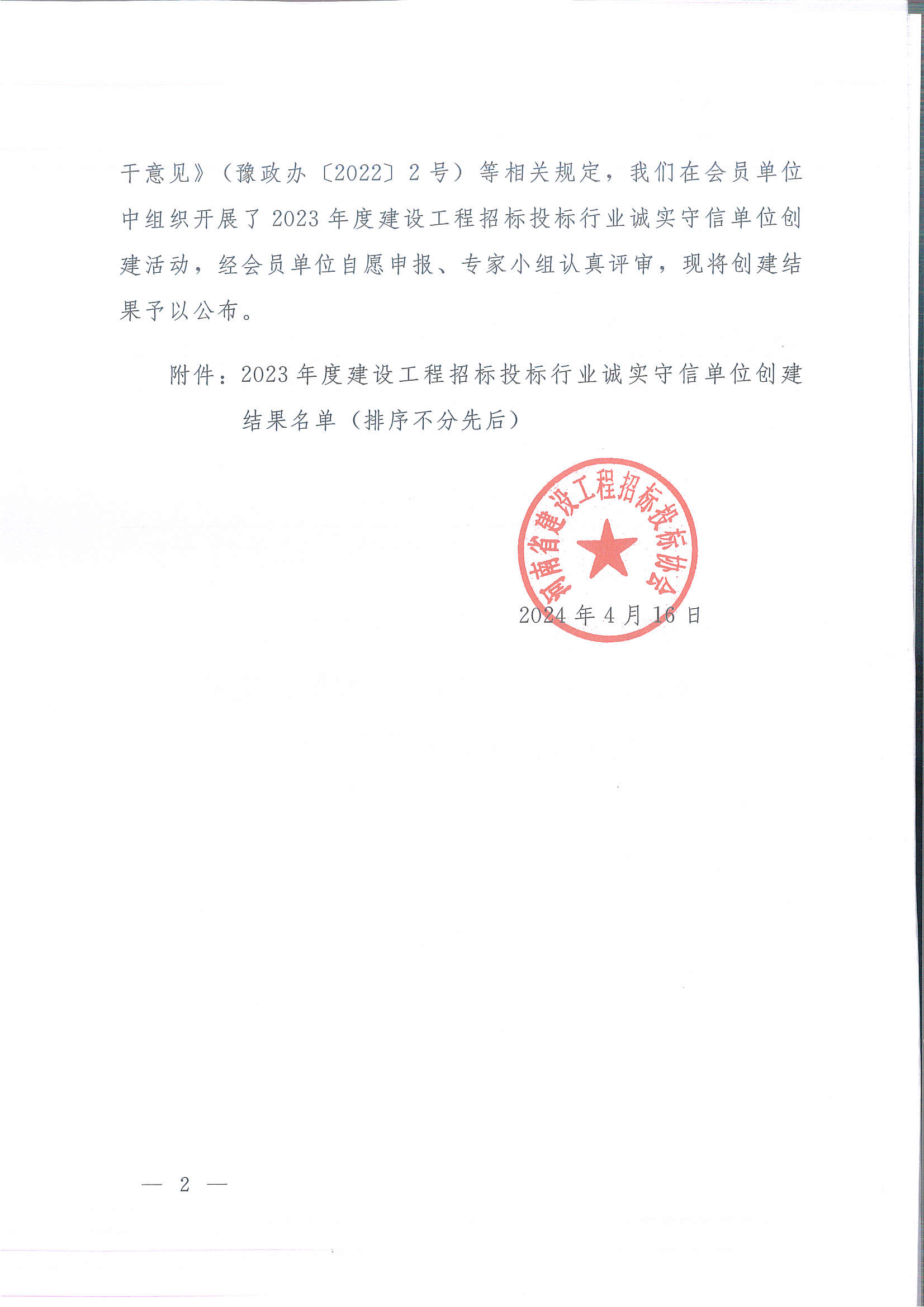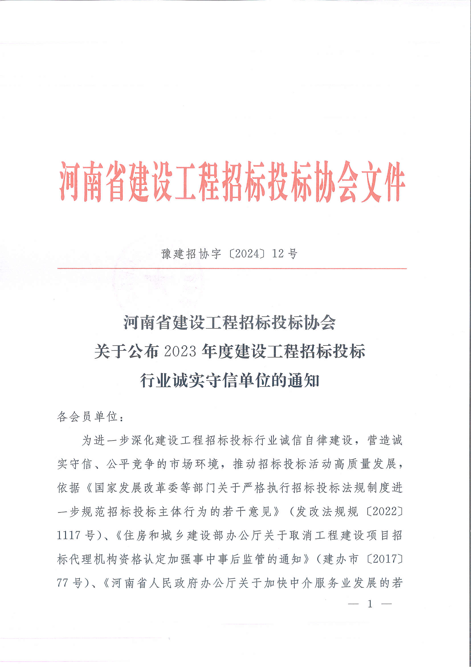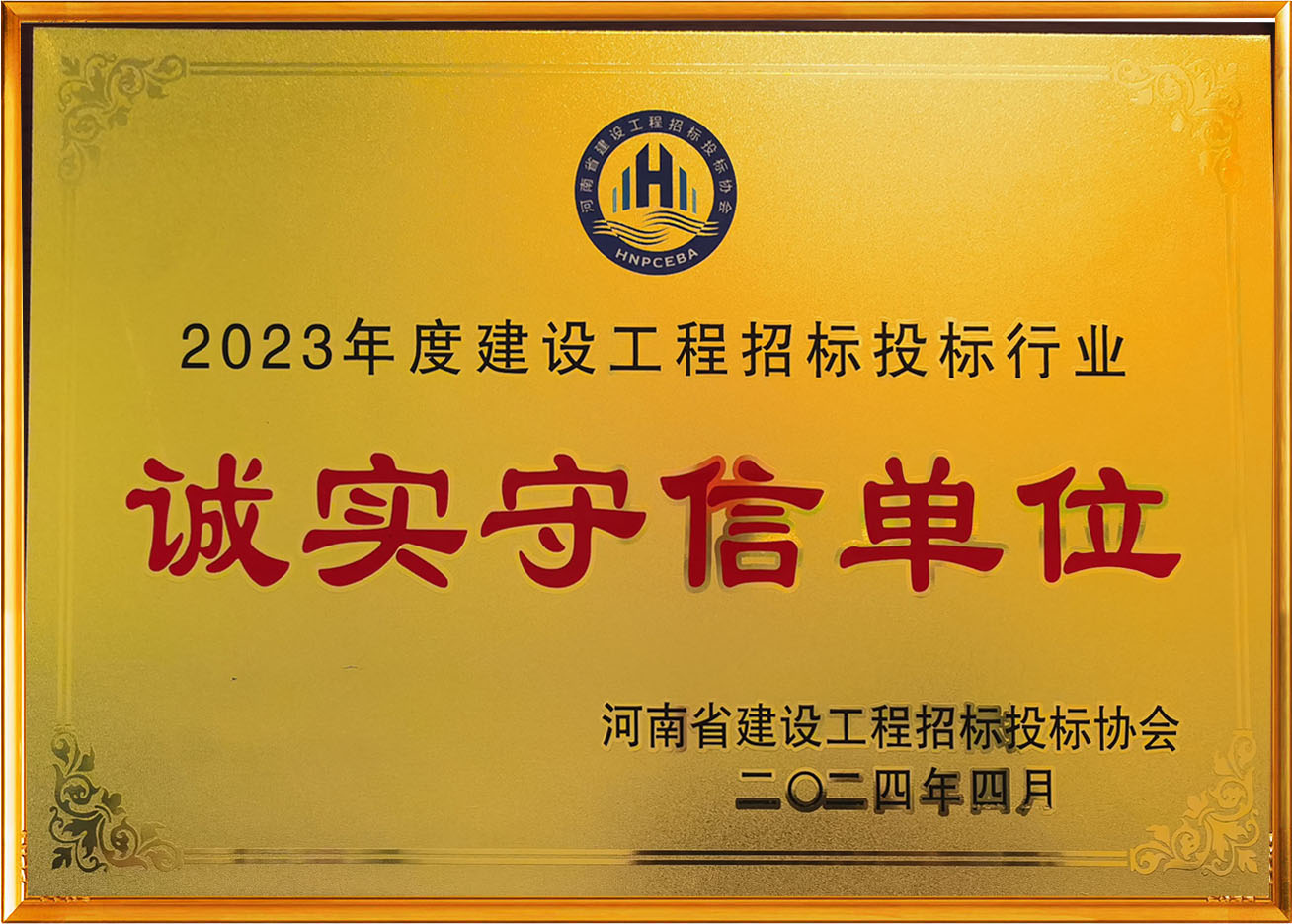 买球赛的正规app凭借企业实力、优秀的项目业绩、健全的管理体系、诚实守信的企业原则及优质的服务能力,经河南省建设工程招标投标协会综合评选,评为2023年度建设工程招标投标行业诚实守信单位。