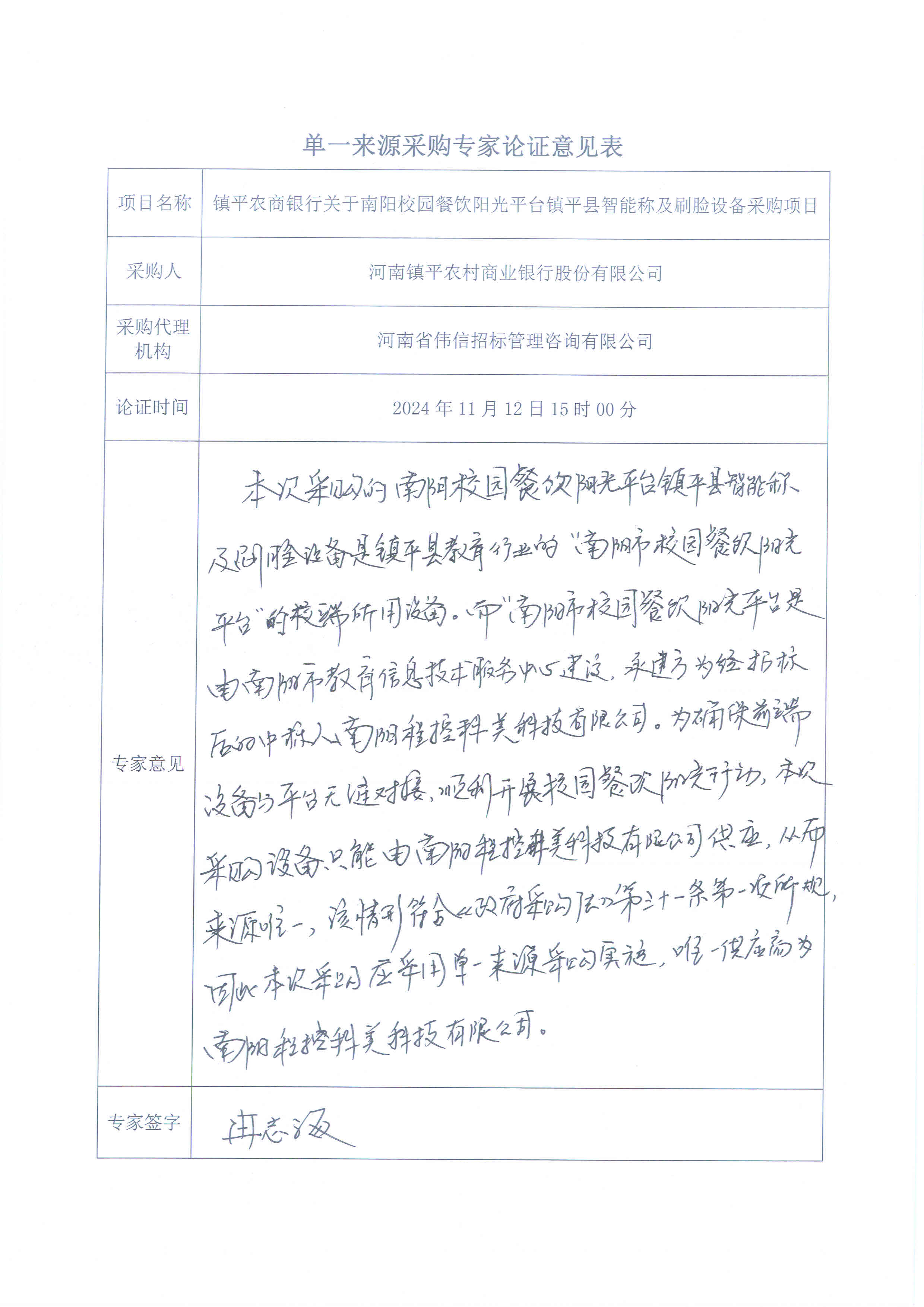 为促进我行业务发展,根据中共南阳市纪律检查委员会、南阳市监察委员会、南阳市教育局联合发布的《关于拟建设“南阳市校园餐饮阳光平台”情况报告》要求,我行承担镇平县校园餐饮阳光平台建设项目。经考察查证,2024年08月15日南阳市教育信息技术服务中心已对“南阳市校园餐饮阳光平台建设开发服务项目”进行了招标,中标人为南阳程控科美科技有限公司,该公司负责该项目的开发建设、更新升级及后续运维工作。在本项目中,智能收货终端及人脸识别终端作为关键硬件组成部分且需与平台系统实现无缝对接、互联互通,以确保食材收货流程的顺畅与稳定。南阳程控科美科技有限公司的智能收货终端及人脸识别终端已经过测试,并与“南阳市校园餐饮阳光平台”系统实现了完美对接。这些设备在功能、性能及接口标准上均符合平台要求,具有高度的兼容性和稳定性。为确保项目实施的连续性和稳定性,避免因设备更换带来的技术风险和时间成本,依据“《中华人民共和国政府采购法》第三十一条(一)只能从唯一供应商处采购的;”规定,本项目拟采用单一来源采购方式进行采购。